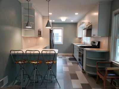 In this remodel we took a 1980’s main level to the modern era, with the help of our former designers, Suzanne Bradley, and the homeowners' beautiful vision. The walls between the atrium & under the staircase were removed along with the walls between the eat-in kitchen/family room, so you could see all the way from the front to the back of the home. The floating stairs & glass railing bring the spaces together and make it possible to enjoy the atrium from more than just one room. We faced the fireplace and surrounded the planter with slate for a cleaner look. The new mid-tone grey bamboo flooring helps to pull the existing oak trim in with the new modern tiles and freshly painted/reworked kitchen cabinets. We removed the wall between the laundry room and mudroom to expand the space while making it more functional for the family.